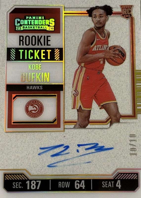 The Kobe Bufkin 2023 Contenders #140 Rookie Ticket Auto - Clear Ticket /10 card in Raw condition has not changed in price in the last 30 days and was last sold for $216.50 .