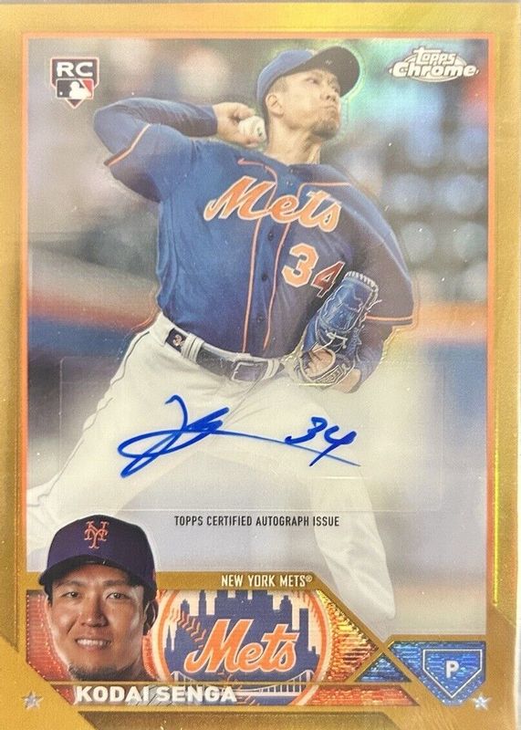 The Kodai Senga 2023 Topps Chrome Update #AC-KSE Autographs - Gold Refractor /50 Rookie card in Raw condition has not changed in price in the last 30 days and was last sold for $75.00 .