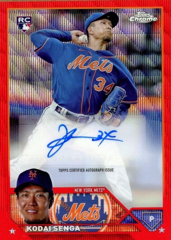 The Kodai Senga 2023 Topps Chrome Update #AC-KSE Autographs - Red Wave Refractor /5 Rookie card in Raw condition has not changed in price in the last 30 days and was last sold for $400.00 .