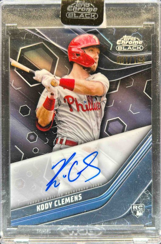 The Kody Clemens 2023 Topps Chrome Black #CBA-KC Autographs - Refractor /150 Rookie card is 1 of 8 Kody Clemens' card variations in the 2023 Topps Chrome Black set being tracked by Sports Card Investor, including Autographs, Autographs - Green Refractor /99, Autographs - Gold Mini Diamond Refractor /50, Autographs - Gold Refractor /50, and Autographs - Orange Refractor /25.