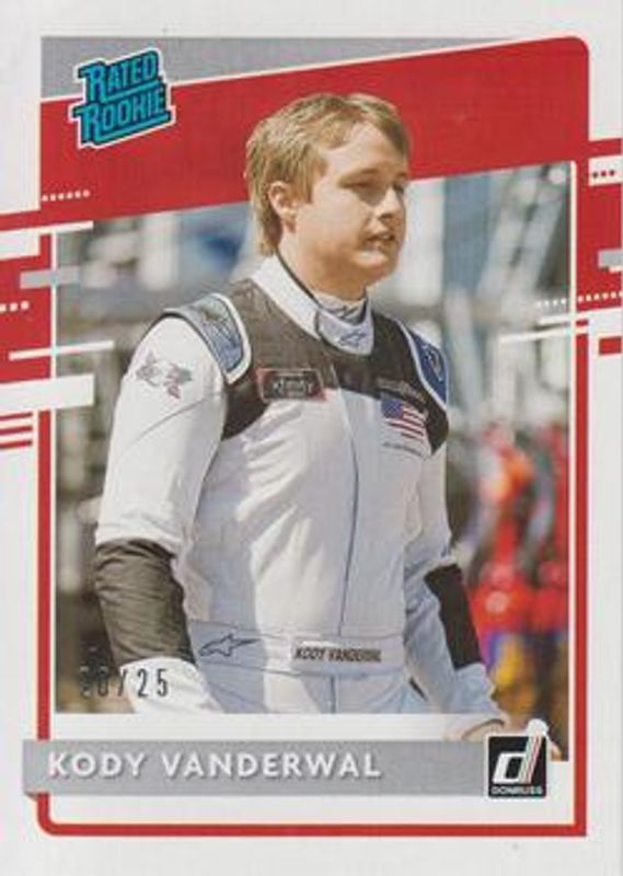 The Kody Vanderwal 2021 Donruss NASCAR #30 Artist Proof /25 Rookie card is 1 of 29 Kody Vanderwal's card variations in the 2021 Donruss NASCAR set being tracked by Sports Card Investor, including Base, Carolina Blue, Orange, Silver, and Red /299.