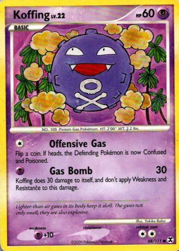 The Koffing 2009 Platinum: Rising Rivals #068/111 Base card in Raw TCG (Lightly Played) condition has moved up $0.32 (+21.3%) in the last 30 days and was last sold for $1.82 .