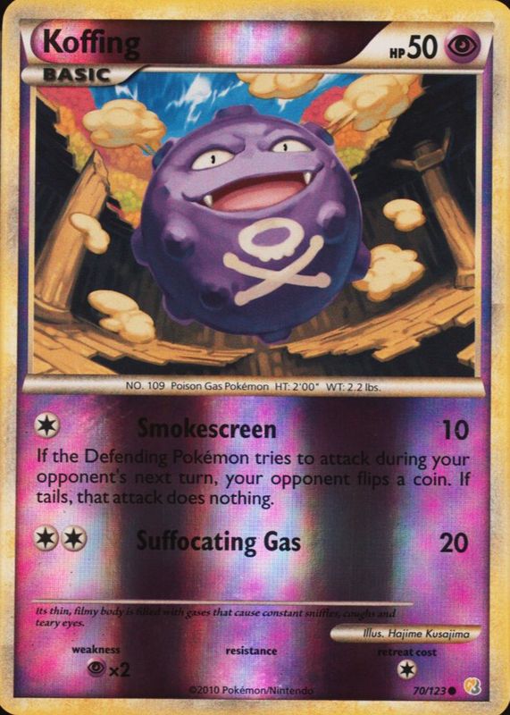 The Koffing 2010 HeartGold & SoulSilver #070/123 Reverse Holo card in Raw TCG (Lightly Played) condition has not changed in price in the last 30 days and was last sold for $7.20 .