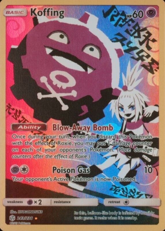 The Koffing 2019 Sun & Moon: Cosmic Eclipse #243/236 Holo (Secret) card in Raw TCG (Near Mint) condition has moved up $10.88 (+49.1%) in the last 30 days and was last sold for $33.03 .