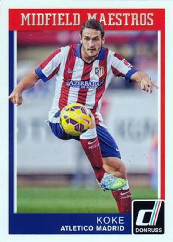 The Koke 2015 Donruss #15 Midfield Maestros card is 1 of 16 Koke's card variations in the 2015 Donruss set being tracked by Sports Card Investor, including Base, Bronze Press Proof /299, Silver Press Proof /199, Gold Press Proof /99, and Red Soccer Ball /49.