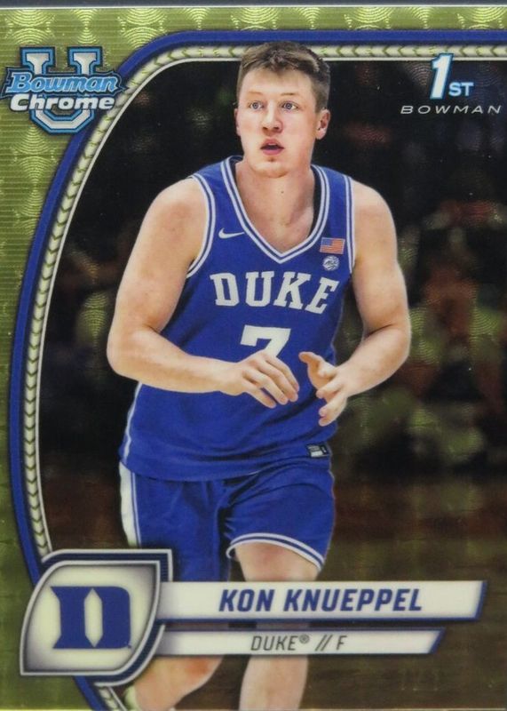 This card is 1 of 46 Kon Knueppel's card variations in the 2024 Bowman Chrome University set being tracked by Sports Card Investor, including Base (1st), Black Wave Refractor (1st), Green Shimmer Refractor (1st), Purple Lava Refractor (1st), and Refractor (1st).