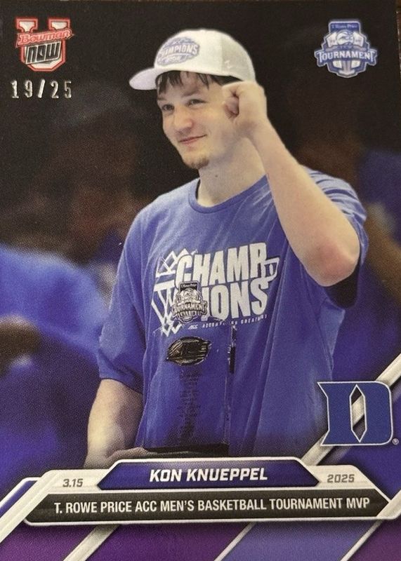 The Kon Knueppel 2024 Bowman U Now #86 Purple /25 card in Raw condition has not changed in price in the last 30 days and was last sold for $65.00 .
