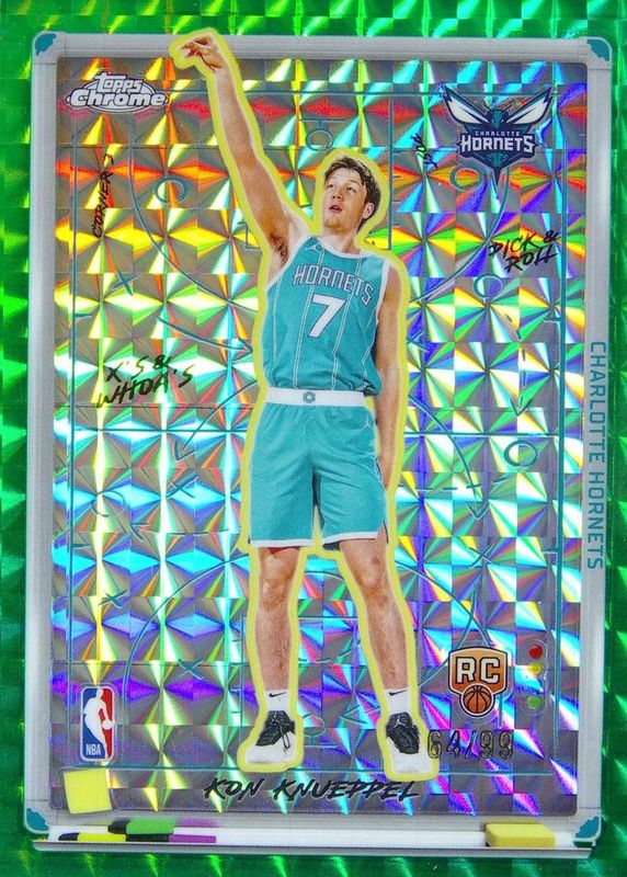 The Kon Knueppel 2025 Topps Chrome #XW-10 Xs & Whoas - Green Geometric Refractor /99 Rookie card in Raw condition has moved up $15.05 (+26.0%) in the last 30 days and was last sold for $73.00 .