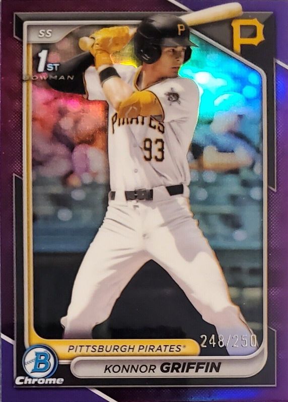 The Konnor Griffin 2024 Bowman Draft #BDC-22 Chrome - Purple Refractor /250 (1st) card in Raw condition has moved down -$29.50 (-12.7%) in the last 30 days and was last sold for $202.50 .