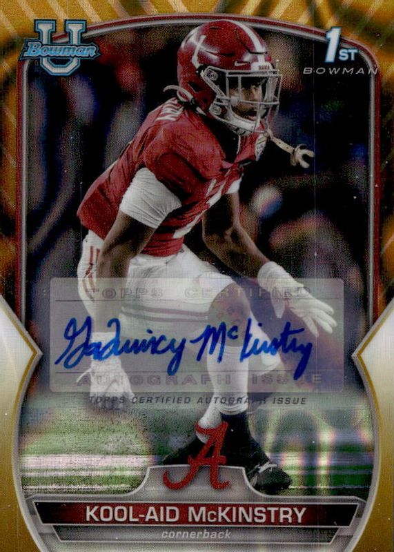 This card is 1 of 37 Kool-Aid McKinstry's card variations in the 2022 Bowman Chrome University set being tracked by Sports Card Investor, including Prospects (1st), Prospects - Pink Refractor (1st), Prospects - Purple Shimmer Refractor (1st), Prospects - Refractor (1st), and Prospects - Purple Mini-Diamond Refractor /399 (1st).