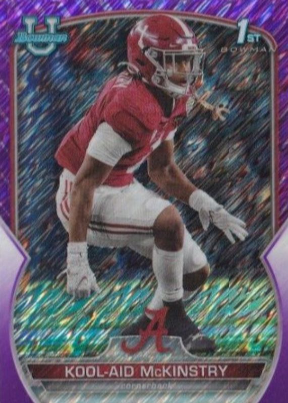 This card is 1 of 37 Kool-Aid McKinstry's card variations in the 2022 Bowman Chrome University set being tracked by Sports Card Investor, including Prospects (1st), Prospects - Pink Refractor (1st), Prospects - Refractor (1st), Prospects - Purple Mini-Diamond Refractor /399 (1st), and Prospects - Purple Refractor /399 (1st).