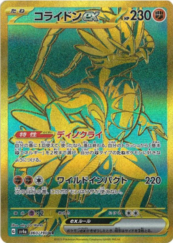 The Koraidon ex 2023 Japanese Scarlet & Violet: Shiny Treasure ex #360/190 Ultra Rare card in Raw TCG (Near Mint) condition has moved up $2.13 (+40.2%) in the last 30 days and was last sold for $7.43 .