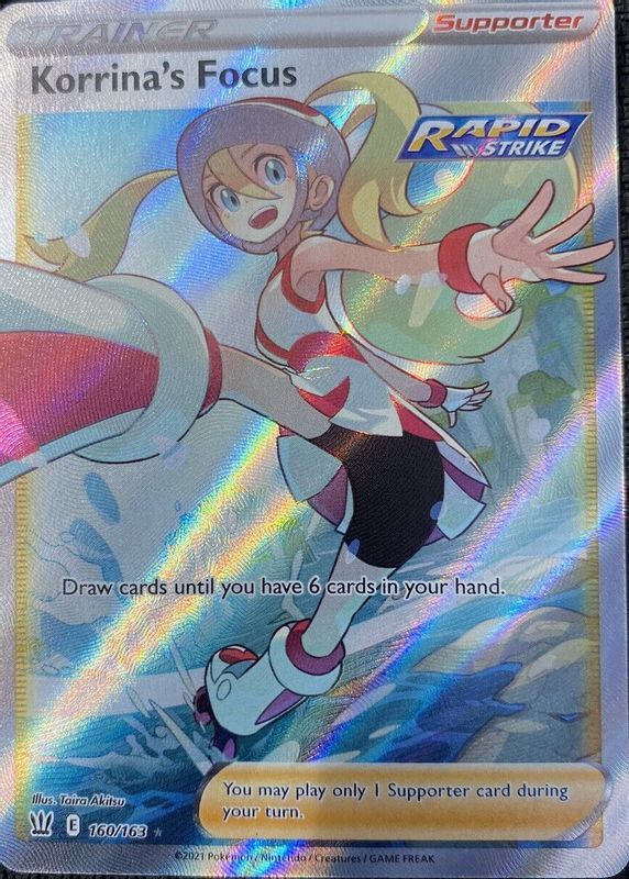 The Korrina's Focus 2021 Sword & Shield: Battle Styles #160/163 Holo (Full Art) card in Raw TCG (Near Mint) condition has moved up $0.35 (+7.5%) in the last 30 days and was last sold for $4.99 .