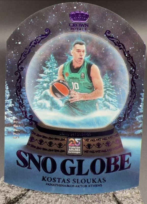 The Kostas Sloukas 2024 Crown Royale EuroLeague #9 Sno Globe - Purple /25 card is 1 of 26 Kostas Sloukas' card variations in the 2024 Crown Royale EuroLeague set being tracked by Sports Card Investor, including Base, Royalty, Crystal Red /49, Crystal Purple /25, and Crystal Gold /10.