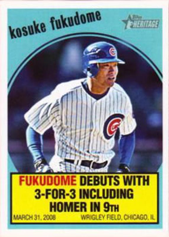 The Kosuke Fukudome 2008 Topps Heritage #FB5 Flashbacks Rookie card is 1 of 6 Kosuke Fukudome's card variations in the 2008 Topps Heritage set being tracked by Sports Card Investor, including Base, Chrome /1959, Chrome Refractor /559, Chrome Refractor Black /59, and Rookie Performers.
