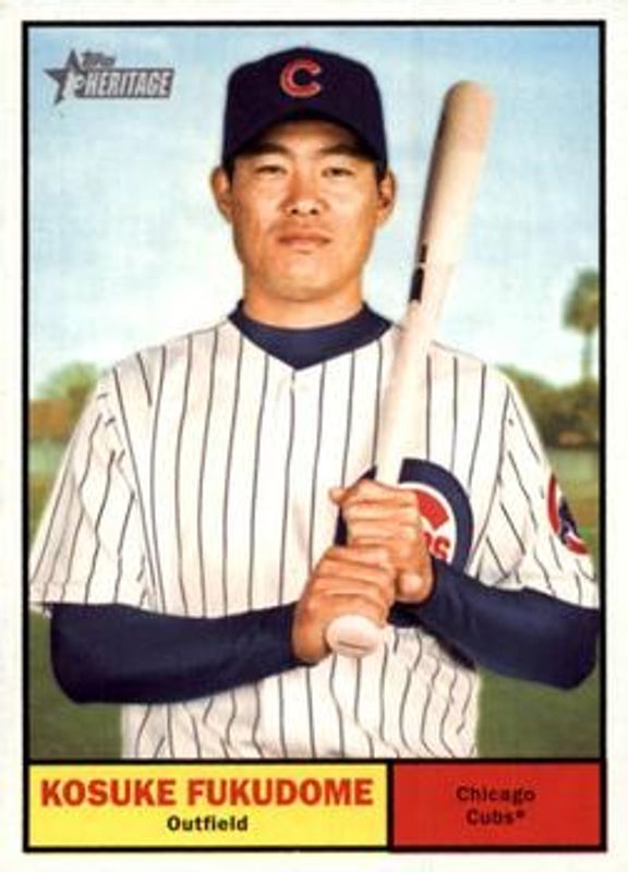 The Kosuke Fukudome 2010 Topps Heritage #141 Base card is 1 of 4 Kosuke Fukudome's card variations in the 2010 Topps Heritage set being tracked by Sports Card Investor, including Chrome /1961, Chrome Refractor /561, and Chrome Black Refractor /61.