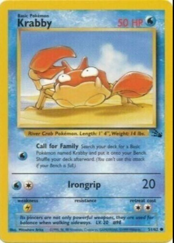 The Krabby 1999 Fossil #51/62 Unlimited card in Raw TCG (Near Mint) condition has moved up $1.63 (+98.8%) in the last 30 days and was last sold for $3.28 .