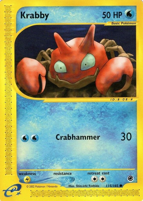 The Krabby 2002 Expedition #115/165 Base card in Raw TCG (Near Mint) condition has moved down -$1.50 (-37.6%) in the last 30 days and was last sold for $2.49 .