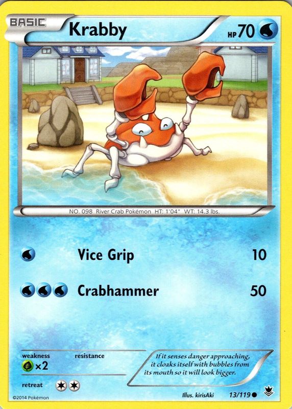 The Krabby 2014 XY: Phantom Forces #013/119 Base card in Raw TCG (Lightly Played) condition has moved up $0.40 (+22.3%) in the last 30 days and was last sold for $2.19 .