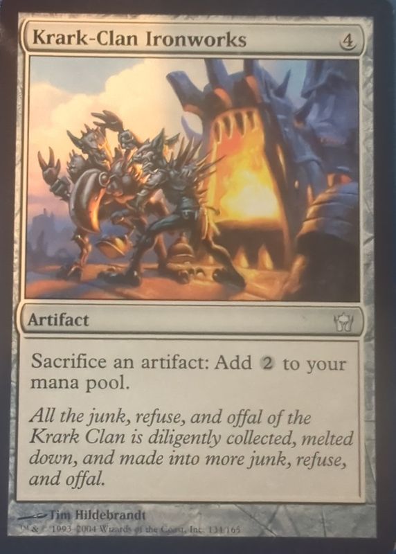 The Krark-Clan Ironworks 2004 Fifth Dawn #134 Base card in Raw TCG (Lightly Played) condition has moved down -$1.50 (-8.6%) in the last 30 days and was last sold for $16.00 .