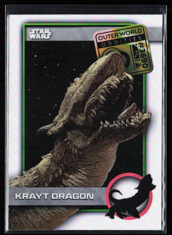 The Krayt Dragon 2025 Topps Chrome Star Wars #UO-9 Outer World Oddities card is 1 of 7 Krayt Dragon's card variations in the 2025 Topps Chrome Star Wars set being tracked by Sports Card Investor, including Outer World Oddities - Kashyyyk Green Refractor /99, Outer World Oddities - Gold Refractor /50, Outer World Oddities - Rebel Orange Orange Refractor /25, Outer World Oddities - Mustafar Black Refractor /10, and Outer World Oddities - Dathomir Red Refractor /5.