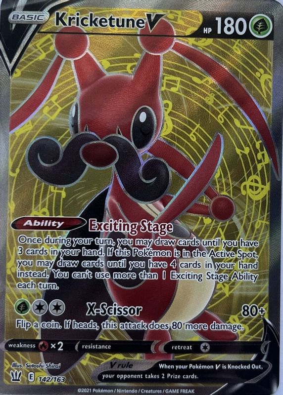The Kricketune V 2021 Sword & Shield: Battle Styles #142/163 Holo (Full Art) card in Raw TCG (Near Mint) condition has moved up $1.00 (+100%) in the last 30 days and was last sold for $2.00 .