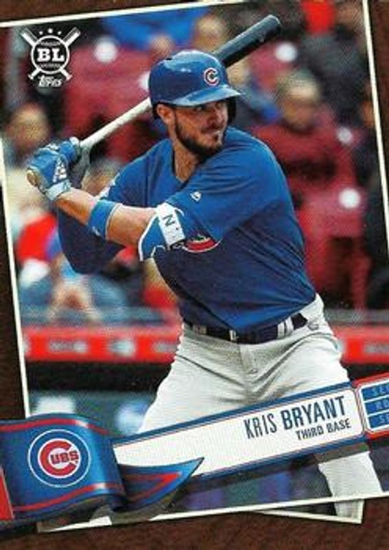 The Kris Bryant 2019 Topps Big League #B2 Blaster Box Cards card is 1 of 11 Kris Bryant's card variations in the 2019 Topps Big League set being tracked by Sports Card Investor, including Base, Blue, Gold, Rainbow Foil /100, and Artist Rendition /50.