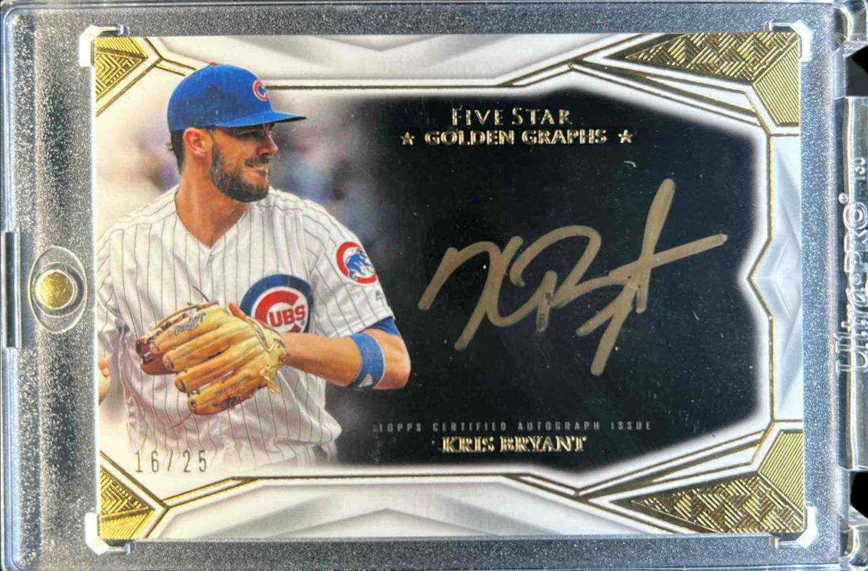 The Kris Bryant 2019 Topps Five Star #GG-KB Golden Graphs /25 card is 1 of 29 Kris Bryant's card variations in the 2019 Topps Five Star set being tracked by Sports Card Investor, including Base, Purple /50, Blue /25, Green /15, and Gold /10.