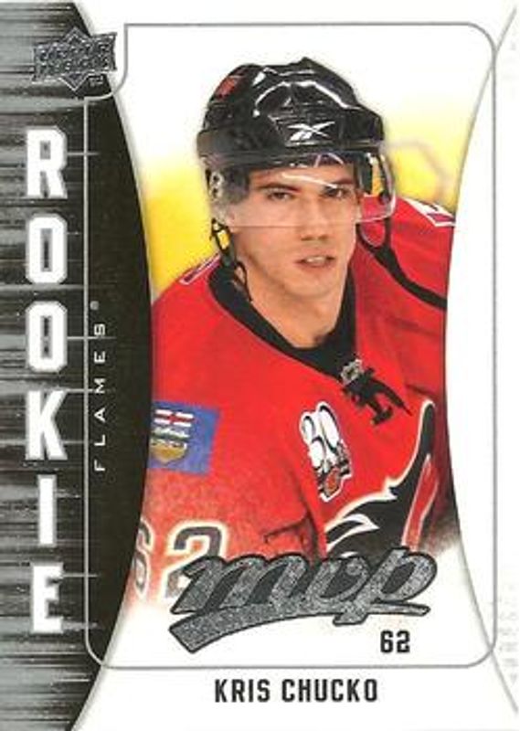 The Kris Chucko 2009 Upper Deck MVP #318 Base Rookie card is 1 of 3 Kris Chucko's card variations in the 2009 Upper Deck MVP set being tracked by Sports Card Investor, including Gold Script /100, and Super Script /25.