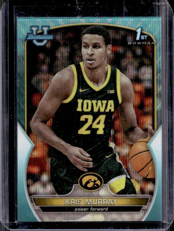 The Kris Murray 2022 Bowman Chrome University #71 Aqua Wave Refractor /299 card is 1 of 38 Kris Murray's card variations in the 2022 Bowman Chrome University set being tracked by Sports Card Investor, including Base, Pink Refractor, Purple Shimmer Refractor, Refractor, and Shimmer Refractor.