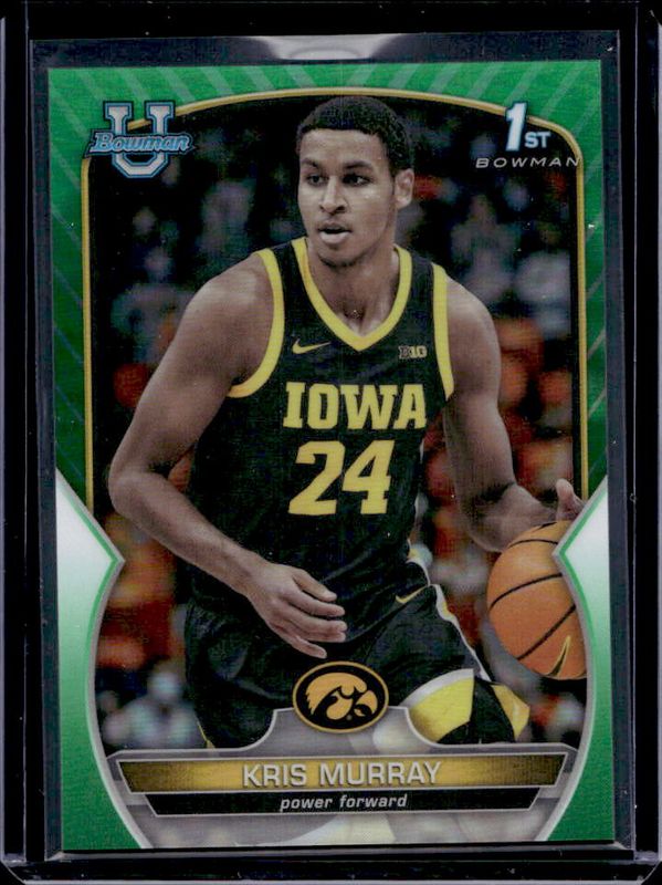 The Kris Murray 2022 Bowman Chrome University #71 Green Refractor /99 card is 1 of 38 Kris Murray's card variations in the 2022 Bowman Chrome University set being tracked by Sports Card Investor, including Base, Pink Refractor, Purple Shimmer Refractor, Refractor, and Shimmer Refractor.