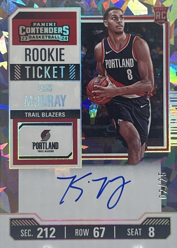 The Kris Murray 2023 Contenders #125 Rookie Ticket Auto - Cracked Ice Ticket /25 card in Raw condition has not changed in price in the last 30 days and was last sold for $48.00 .