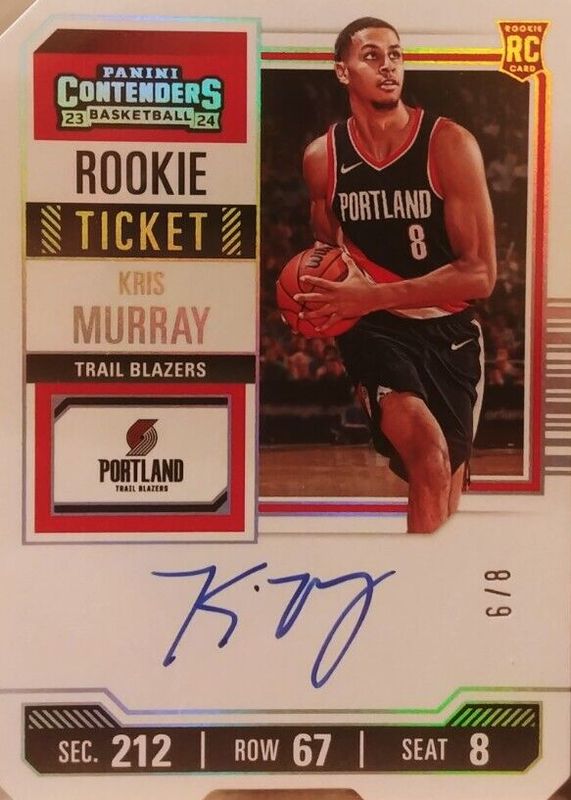 The Kris Murray 2023 Contenders #125 Rookie Ticket Auto - Ticket Stub (/8) card in Raw condition has not changed in price in the last 30 days and was last sold for $45.88 .