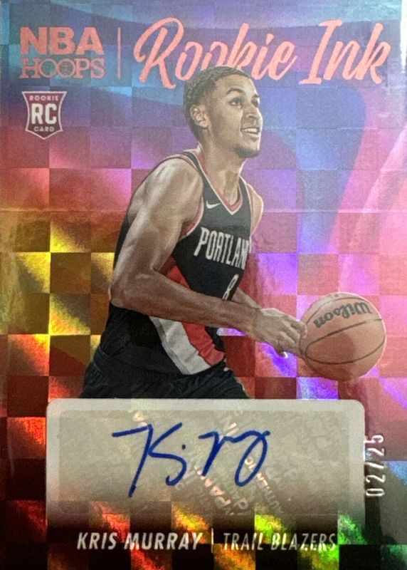 The Kris Murray 2023 Hoops #RI-MUR Rookie Ink - Red /25 card in Raw condition has not changed in price in the last 30 days and was last sold for $45.00 .
