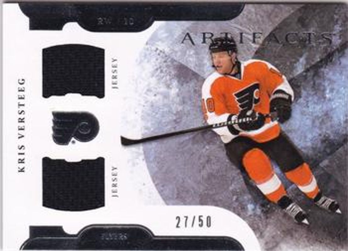 The Kris Versteeg 2011 Upper Deck Artifacts #32 Horizontal Jerseys /50 card is 1 of 16 Kris Versteeg's card variations in the 2011 Upper Deck Artifacts set being tracked by Sports Card Investor, including Base /699, Emerald /99, Spectrum /25, Black /5, and Jerseys /125.