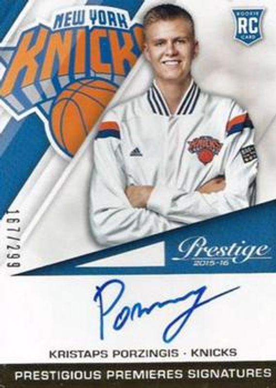 The Kristaps Porzingis 2015 Prestige #PPS-KP Prestigious Premieres Signatures /299 Rookie card is 1 of 20 Kristaps Porzingis' card variations in the 2015 Prestige set being tracked by Sports Card Investor, including Base, Bonus Shots Light Blue, Bonus Shots Red /199, Bonus Shots Orange Die-Cut /149, and Bonus Shots Blue /99.