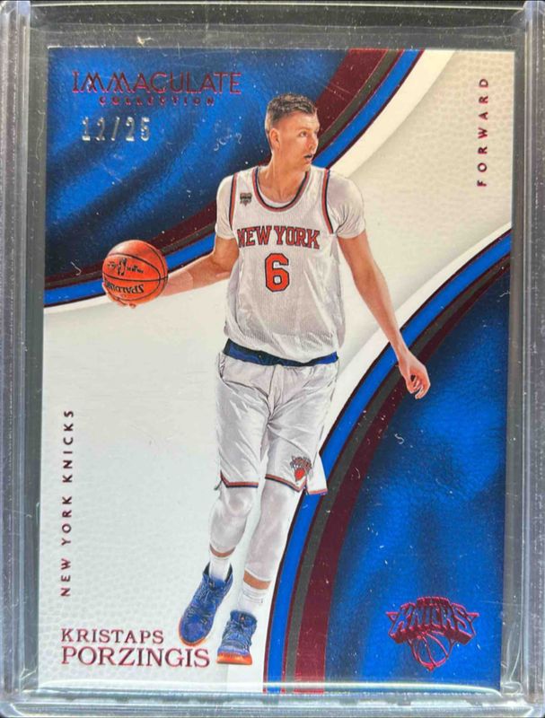 The Kristaps Porzingis 2016 Immaculate #64 Red /25 card is 1 of 23 Kristaps Porzingis' card variations in the 2016 Immaculate set being tracked by Sports Card Investor, including Base /99, Blue /35, Gold /10, Emerald Special /5, and Platinum /1.