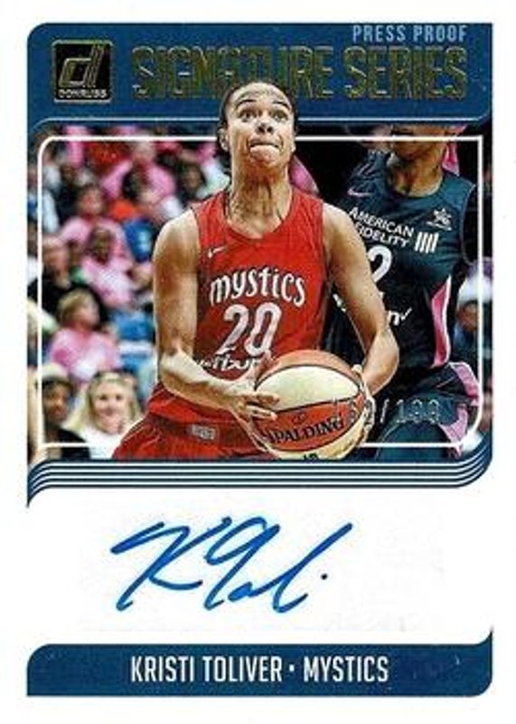 The Kristi Toliver 2019 Donruss WNBA #SS-KTL Signatures Series - Press Proof /199 card is 1 of 29 Kristi Toliver's card variations in the 2019 Donruss WNBA set being tracked by Sports Card Investor, including Base, Optic, Optic Holo, Silver Press Proof /199, and Purple Press Proof /99.