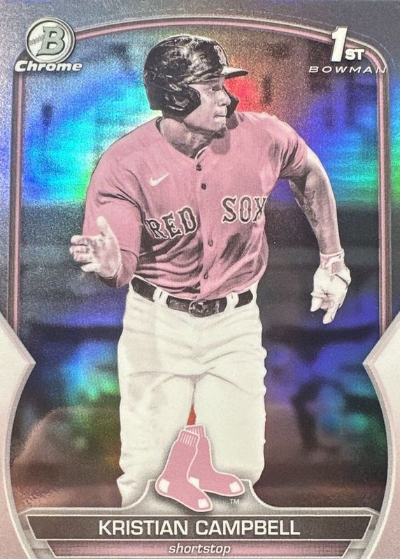 The Kristian Campbell 2023 Bowman Draft #BDC-125 Chrome - Pearl Refractor (1st) card in Raw condition has not changed in price in the last 30 days and was last sold for $128.95 .