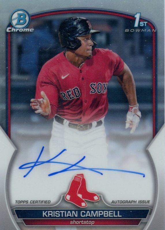 The Kristian Campbell 2023 Bowman Draft #CDA-KCA Chrome Prospect Auto - Refractor /499 (1st) card in Raw condition has moved up $19.00 (+35.2%) in the last 30 days and was last sold for $73.00 .