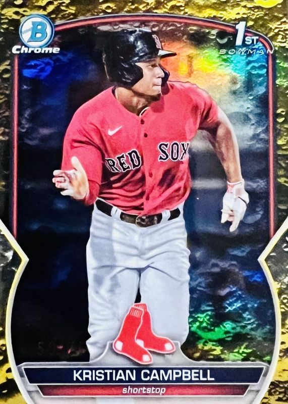 This card is 1 of 43 Kristian Campbell's card variations in the 2023 Bowman Draft set being tracked by Sports Card Investor, including Chrome (1st), Chrome - Japan Refractor (1st), Chrome - Lunar Glow Refractor (1st), Chrome - Pearl Refractor (1st), and Chrome - Refractor (1st).