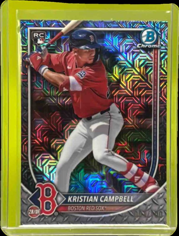 The Kristian Campbell 2025 Bowman Chrome Mega Box #58 Mojo Refractor Rookie card is 1 of 29 Kristian Campbell's card variations in the 2025 Bowman Chrome Mega Box set being tracked by Sports Card Investor, including #MR-16 Mojo Refractor, #CRA-KC Mojo Refractor, #58 Aqua Mojo Refractor /299, #MR-16 Purple Mojo Refractor /250, and #58 Purple Mojo Refractor /250.