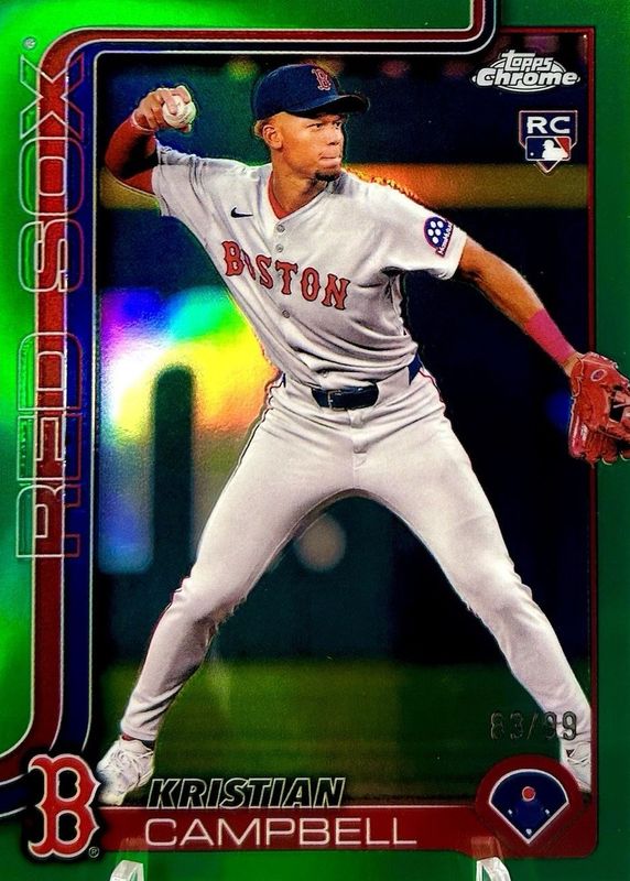 The Kristian Campbell 2025 Topps Chrome #171 Green Refractor /99 Rookie card in Raw condition has moved up $12.50 (+227%) in the last 30 days and was last sold for $18.00 .
