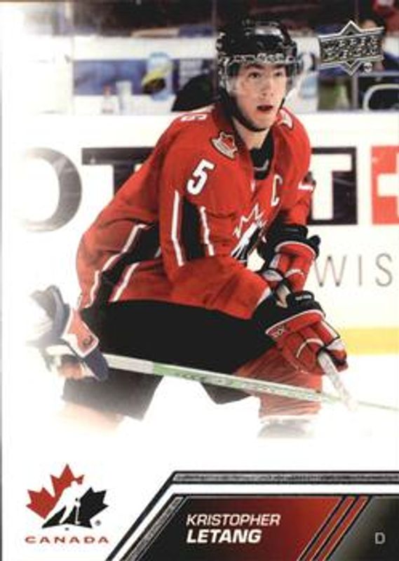 The Kristopher Letang 2013 Upper Deck Team Canada #176 Base card is 1 of 11 Kristopher Letang's card variations in the 2013 Upper Deck Team Canada set being tracked by Sports Card Investor, including Exclusive Red /100, High Gloss Gold /10, Printing Plates Black /1, Printing Plates Cyan /1, and Printing Plates Magenta /1.