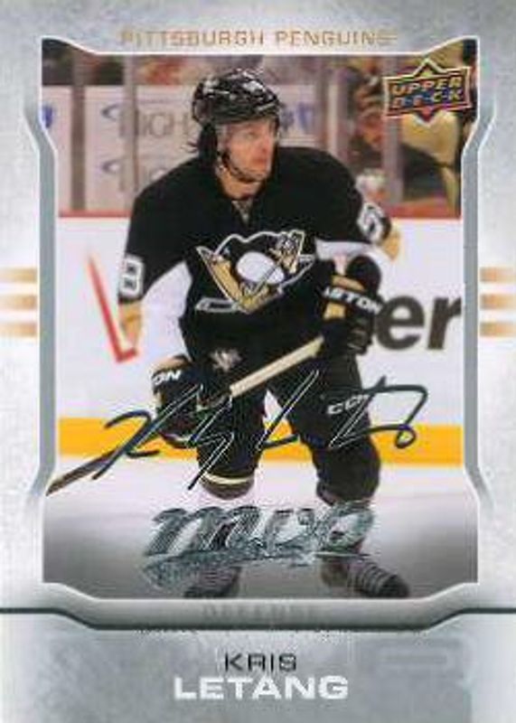 The Kristopher Letang 2014 Upper Deck MVP #275 Silver Script card is 1 of 9 Kristopher Letang's card variations in the 2014 Upper Deck MVP set being tracked by Sports Card Investor, including Base, Colors & Contours, Gold Script /100, Super Script /25, and Printing Plates Black /1.