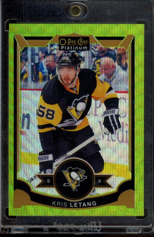 The Kristopher Letang 2016 O-Pee-Chee Platinum #39 Emerald Surge /10 card is 1 of 14 Kristopher Letang's card variations in the 2016 O-Pee-Chee Platinum set being tracked by Sports Card Investor, including Base, Ice Blue Traxx, Rainbow, Rainbow Color Wheel, and Red Prism /199.
