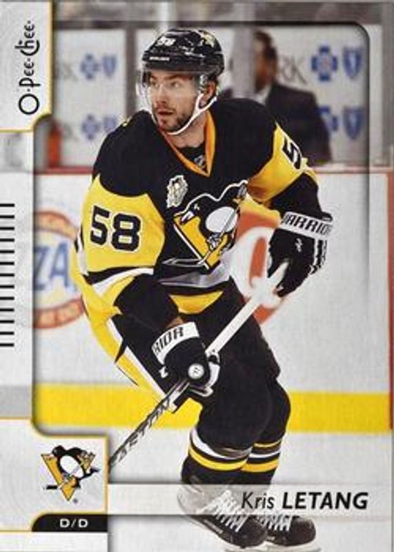 The Kristopher Letang 2017 O-Pee-Chee #197 Base card is 1 of 6 Kristopher Letang's card variations in the 2017 O-Pee-Chee set being tracked by Sports Card Investor, including Rainbow Foil, Red, Retro, Retro Blank Back, and Black Rainbow Foil /100.