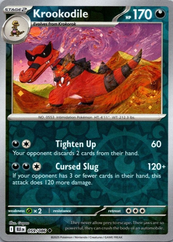 The Krookodile 2025 Scarlet & Violet: Black Bolt #059/086 Base card in Raw TCG (Near Mint) condition has moved down -$0.01 (-1.0%) in the last 30 days and was last sold for $0.99 .