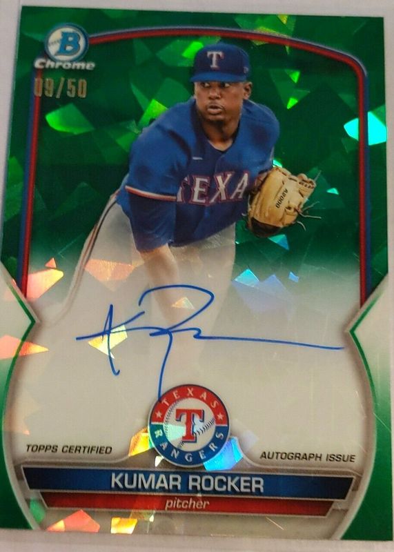 2023 Bowman Sapphire Kumar Rocker #BSPA-KR Green #D /50 Rangers Prospect RC AUTO