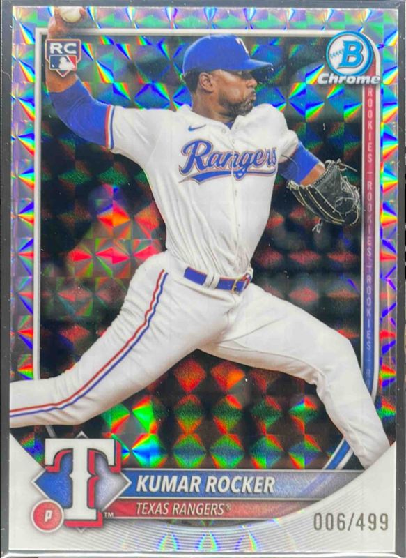 The Kumar Rocker 2025 Bowman Chrome #98 Geometric Refractor /499 Rookie card is 1 of 35 Kumar Rocker's card variations in the 2025 Bowman Chrome set being tracked by Sports Card Investor, including Base, Refractor /499, Pulsar Refractor /399, Fuchsia Refractor /299, and Fuchsia Wave Refractor /299.